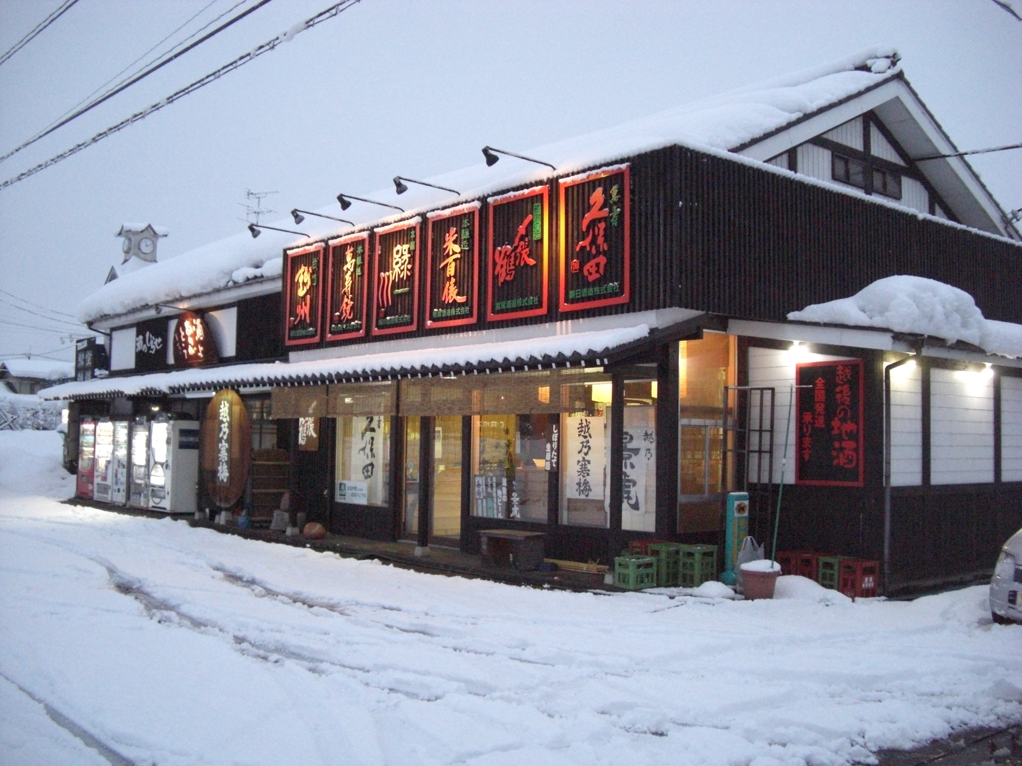 旧店舗・夕暮れ時の雪景色
